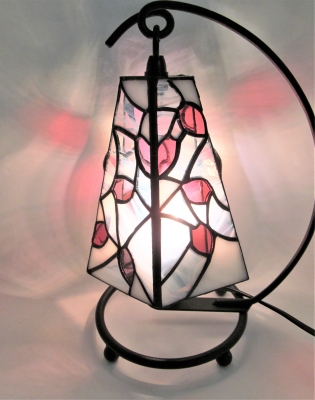 JUGEMテーマ:ステンドグラス 5角形の 桜のランプを制作されました 大きな3面に スリットが2面入っています ピンクのガラスは、アンティーク 職人さんの手作りガラスです 点灯していない時も 美しいです ...
