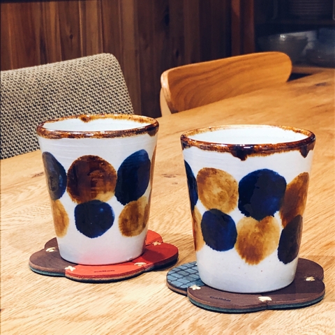 実は、今日が僕の誕生日だったんですが、お客さんから沖縄の焼き物"やちむん"の湯飲みを頂きました。沖縄の方言で焼き物の事をやちむんと言うそうです。"やむちん"ではなく"やちむん"との事。 早速ガロンのレザーコースターと合わせてみたのですが、なかなか似合うんじゃないでしょうか。定番のマグカップと組み合わせるだけでなく、日本の焼き物にも使って欲しい本革コースターです。WEB SHOPでも色々な食器と組み合わせた使用例を載せているので、参考にしていただければ...