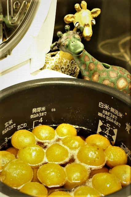 JUGEMテーマ:陶芸 頂いた完熟梅を炊飯器で甘露煮をつくっています。 もうすぐ出来上がり。 キリン達も早く出来ないかと見守っています。