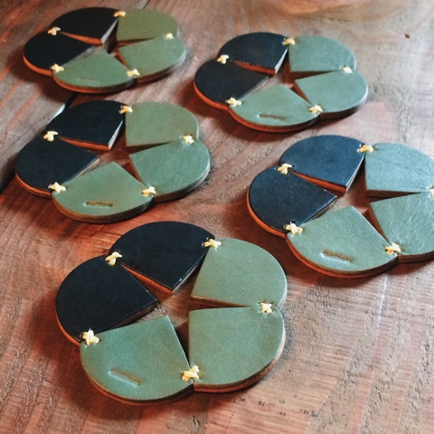 「因州・中井窯の食器に合わせて使いたい」という粋なオーダーがあり、製作させて頂いたレザーコースターです。 元々は先月アップしたレザーコースターのラインナップに含まれていたカラーだったのですが、"全部で5枚欲しい"というご要望から製作する事になりました。コースター1枚から食器とのコーディネートまで連想してもらえたようで、作り手としては非常に嬉しいご注文でした。 お問い合わせいただいた後さっそく中井窯について検索してみたところ、なかなか納得のカラーリン...