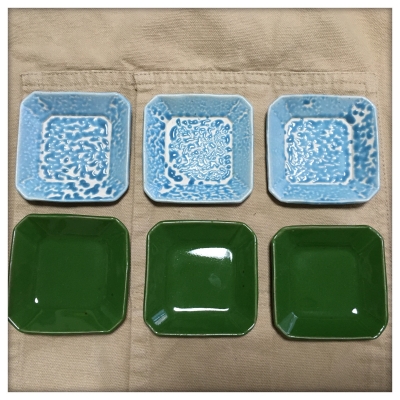 漬物やお塩、お醤油用のサイズの小皿を作りました。 緑のテカリ具合がハンパない! (ライトグリーンにならないかと淡い期待をしていたのだけど) トルコブルーの釉薬が手に入ったのでお試しにと先生が釉薬を調合してくれたのだけど・・・はじいた! 斑模様・・・これはこれで味があるけれど、素地がむき出しになっているから、料理用には使えず。 しかもトルコブルー(=ターコイズブルー)ではなくて、水色のような??それはそれでいいんだけど… アロマス...