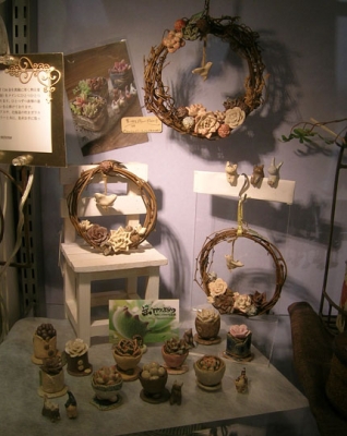 こんばんは☆ すっかり寒い毎日になりましたね 毎年、この一番寒い時期は、展示会を休んでいますが 陶器の小物など寒さしらずのものたちは いつもお世話になってる、板橋のサリクラフトさんに飾らせてもらっていています うちにいても、箱の中に入ってるだけになっちゃいますからね^^; 葉ッppy陶多肉のコーナーです^^ 今は、リースがメインかな ミニミニ陶多肉の鉢たちもいます もちろん!底穴あり おそろいのお皿...