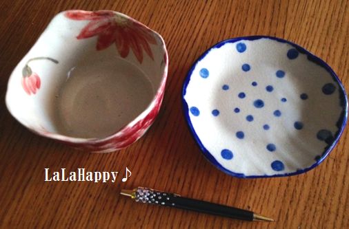 JUGEMテーマ:陶芸今日は、午後から陶芸教室の日お花の形の中皿と、アロマオイルを炊く入れ物をつくって、葉っぱとお花のお皿に釉薬をつけました。作る作業は室内なんだけど、釉薬をつけるのと、水道は屋外です。今日は、得にめっちゃ寒かった〜水道の水が冷たすぎて、手がちぎれそうでしたこの冬の初雪が降った日だからねっあ、もしかして、12月のめっちゃ寒いときにも降ったかな去年、釉薬をかけた器が2つ、できあがっていました。変形の中鉢と、変形の五寸皿です。土は半磁器。青の絵の具で水玉を描いて、ふちに、ルリ紺の釉薬でラ...