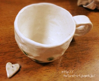 JUGEMテーマ:陶芸 前のお仕事の仲間と参加した陶芸教室でつくった陶芸作品、完成しました!( 七月の末にはできあがっていたんですが、なかなか伺う時間がとれなくて; )a new sproutさんにて。持ち手のしっかりした白土のカップをつくりましたヾ(●´▽`●)ノ半分より下側に、グリーンのドット模様が入っています☆つくったときよりやっぱちょっとちっちゃくなってました(=´∇`=)あまった土でつくったチャームもしっかりドットが入っていました(●´ω`●)写真、白く飛んじゃって見づらいですが(ノд・。)ネックレスにするかブローチにす...