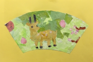 絵画クラスでは、 ちぎり絵の授業を行いました。 今回は和風の扇のかたちにどんな絵を描こうかイメージをしてから、水で濡らした和紙に水彩絵の具を2色以上混ぜて綺麗な染め紙をつくります。次に、扇に下描きをして和紙が乾いたら、手でちぎってパズルのように少しずつ貼っていきます。 ちぎり絵が出来たら、色紙の台紙に貼り付け完成です!今回も春らしい素敵な作品が揃いました。 (クリックすると拡大表示されます) 若葉の中で、春の訪れを感じている鹿を描いたのは、4年生のKちゃんです。鹿の視線の...