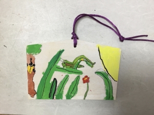 絵画クラスは絵馬作りをおこないました。 神社にあるものとは違い、裏表なにもかいていない絵馬を自分のオリジナル作品にします! どんな絵を描くかを決め、アクリル絵の具で重ね塗りをしたり、今年の抱負やお願いごとをかいたり、工夫をして様々な絵馬が完成しました。 大好きなバッタやカブトムシが太陽に照らされていて、日本画のような風流な作品に仕上っていますね。 ウグイスが青い空の遠くを眺めていて、こちらも風流な作品に仕上っています。お堂の建物もよく描けていますね。無病息...