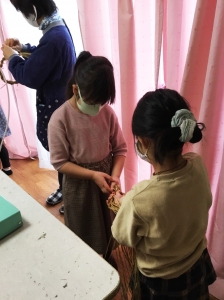 造形クラスでは、昨年末に毎年恒例のしめ縄を作りました。 稲わらを湿らせたものを2本に分け、ひねりながら編んでいきます。輪の形に整え、折り紙で作った扇、鶴、願い事を書いた「しで」せんりょう、松ぼっくりなどを飾ります。みんなとても華やかで、お正月を彩るすてきなしめ縄が出来ました。 2年生同士で、しめ縄を編んでいます。一人が編んで、もう一人はしっかりとしめ縄を握っています。しっかり編まないと崩れてしまうので、とても難しい作業です。 6年生のKさんは、とてもお正月らしい...