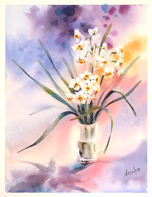年末にご近所さんにスイセンをいただきました。 お庭に咲いていたのをちょきちょき切った、切りたての花です。 う〜ん、香りがすごい!! 部屋中、スイセンの、なにか清潔な感じのする香りで満たされました。 せっかくなので、新年早々、描き初めでこのスイセンを描きました。 しゃれた花器がないので、手ごろなグラスに差して、 うむむ、ちょっと貧乏くさい 笑