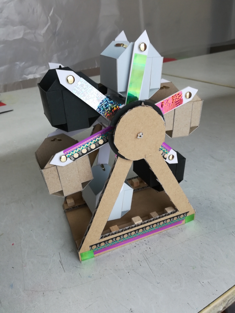 立体造形クラスでは、厚紙や段ボール、割ピンなどを使って、観覧車を作りました。 6つの箱に洗濯バサミやビー玉を入れると、勢いよく回ります! 4年生のK君は、華やかな観覧車です。 とてもよく回ります! 5年生のK君は、材木で作った台の上に観覧車を乗せてみました!台もいろいろ利用出来そうですね。 3年生のH君は、観覧車を作っているところです。部品も沢山作りました。 5年生のNさんの観覧車は、沢山Mテープを貼りました。まる...