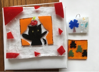 造形クラスでは、3月にガラス制作をしました。毎回ガラスは大人気! 高学年の希望者はお皿、その他の人は小さめのガラスからキーホルダーや髪留め、マグネット、箸置き…など作りたい物を考えて作りました。 このように、ガラス専用のカラーシートと細かいガラスを組み合わせて貼ります。 それを専用の窯で730度に熱すると… このように素敵な作品が出来ました! 左のネコちゃんは、お家でネコを飼っているHちゃんの作品です。 右は、体験で作ってくれたMちゃん...