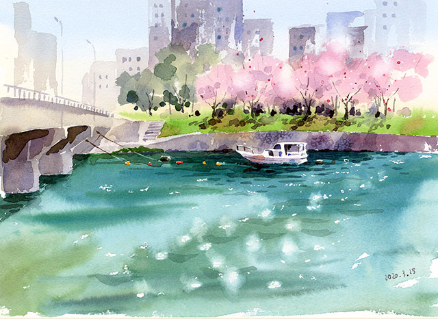 コロナ騒動で、仕事もゆっくり。 この時期こそスキルアップを!!と、毎日絵を描いています。 先日、春先のまだ寒い日に、スケッチに行きました。 水面がキラッツキラッ✨に、光っていました。ピカピカ。 しかし、寒い。 こごえながら、川沿いの緑地に座って描きました。 前から、ここに停留している船を描きたいと思っていたので、 初チャレンジ。 完成して立ち上がったとき、寒さで?体が固まっていて、 ヨロヨロの足で水入れのバケツを踏んづけ破壊…。 残念っ…・ ...