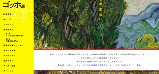 絵画ファンの皆さま、こんにちは! 今日は残念なお知らせを一つご紹介します。 兵庫県立美術館で開催されていた【ゴッホ展】が、3月24日をもって閉幕しました。 原因はやはり新型コロナウイルス。 まずはHPで発表された文面をご紹介します。 画像が小さく見えづらいかと思いますが、 「新型コロナウイルス完成拡大防止のため、兵庫県立美術館が3月31日まで臨時休館を決定しました。」 「それに伴いゴッホ展は閉幕いたします」 だそうです。 2020年1...