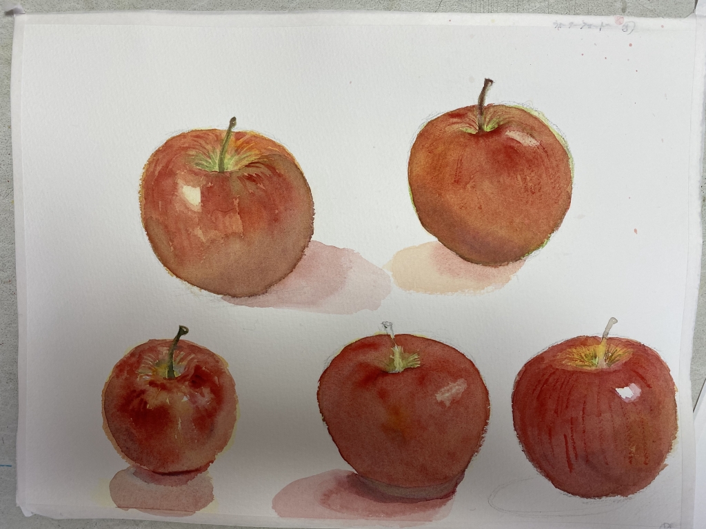 大人水彩画クラスでは 本日は林檎、椿、金柑の続きを描きました。 皆さん、すごくレベルアップしています。 林檎を、ご自宅でたくさん練習されたそうです。 たくさんの林檎、可愛いですね。 皆さままだ途中ですが、 デッサン力がついてきましたので、 新たに表現技術を模索しています。 ...