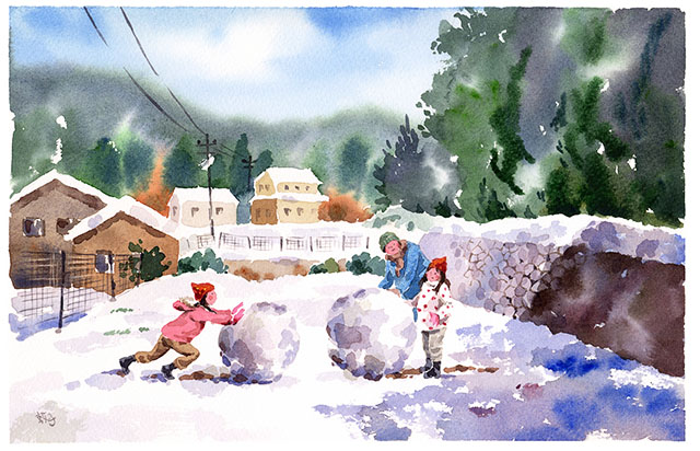 今年の冬はほんとに暖かい。 雪もまったく見てないです。 昔の思い出の写真から描きました。 お正月に帰省したとき、母と姪たちと作った雪だるま。 父と姉と私も参加して、 雪だるまが何個もできたっけ。 力いっぱい雪玉を転がす姪ちゃんがかわいかったです。