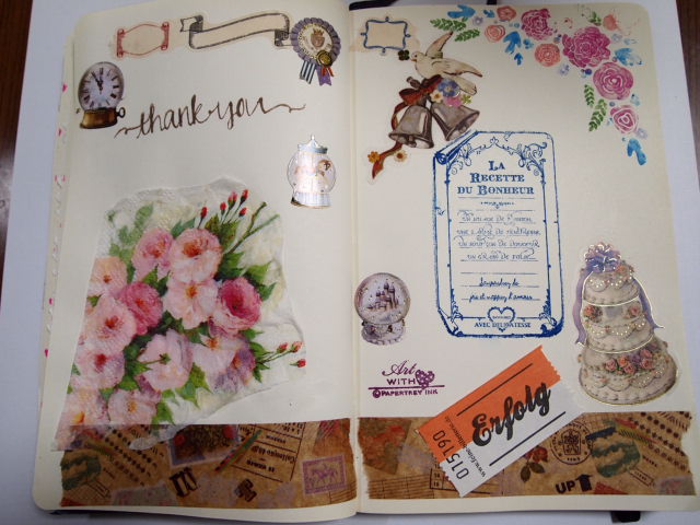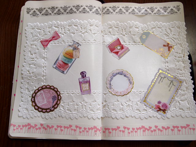 JUGEMテーマ:コラージュ こんにちは。 本日2度目の更新です。 今日はモレスキンに2パターン、ペタペタしてみました。 ますは可愛い感じな、モレスキン。 大きくて長方形のレースペーパーをまず貼りたくて、貼ってみました。 それに、メーカーをど忘れしてしまいましたが外国製のハートのマステを下に貼り、 上にプリマのマステを貼ってみました。 あとは、フレークシールのソレイユシールを貼って可愛らしい感じに。 次は、シックだけど可愛い感じのモレスキン。 昨日届いた、こどものかおのブーケ...