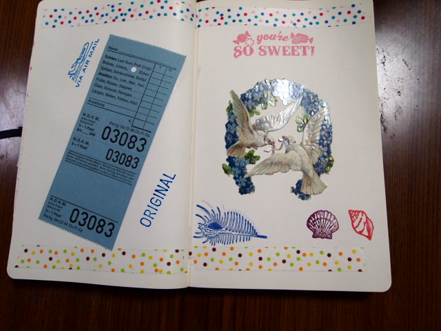JUGEMテーマ:コラージュ 今日のモレスキンです。 シンプル・イズ・ベストっていうことで。 クロモスや、スモールセレクトさんで購入したチケットに、 カモ井さんのマステや、シャチハタのオフィススタンプと こどものかおのこよみはんこに、 マーサ・スチュワートのスタンプを使ってます。 最後まで読んでくれて、ありがとうー!!