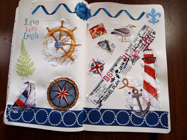 JUGEMテーマ:コラージュ おはようございます♪ 今朝もモレスキンにペタペタしました。 こんな感じです。 メインに使っている素材はペーパーナプキンです。 それにカモ井さんのリボンのブルーとミナとコラボしたマステと somitapeを使いました。 それに、マーサ・スチュワートのイカリのパンチを貼り、 フェイバリットシールの切手モチーフのを貼ってます。 (切手モチーフも大好きな人←) で、空いた場所にこどものかおの、チェリッシュスタンプのシダと 「Live Love Laugh」というセンチメントを使い...