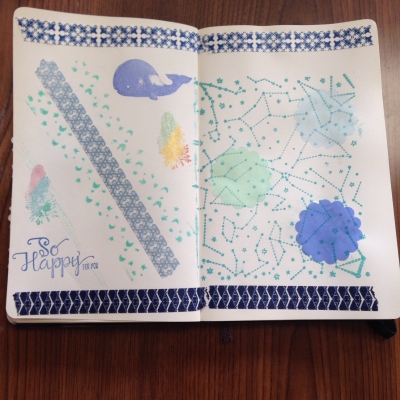 JUGEMテーマ:コラージュ おはようございます〜。 朝から超暑いですねー。 で、今日もモレスキンにペタペタしてました。 クジラさんが思いっきり掠れてしまいましたが(^^; やっぱりノープランで始まった、今日のモレスキンです。 とりあえずマークスのエビシリーズのブルーを最初に手に取って、 上下に貼ったら、ヒーローアーツの星座スタンプを捺したくなって インクはエイブリーエルのAQUAMARINEで捺してみました。 そうしたら、昨日届いたのりのピットマルチ・2を使いたく なったので、ヴェラム紙をクッ...