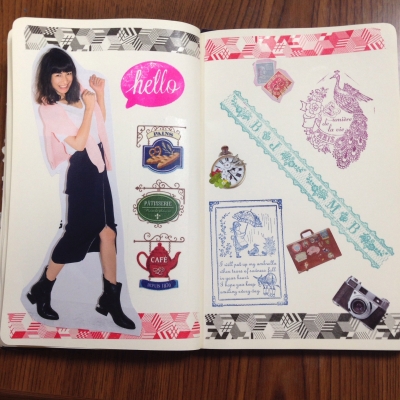 JUGEMテーマ:コラージュ こんな夜更けですが、こんばんは。 昨日もモレスキンにペタペタしてました。 オトナミューズに載っていたモデルさんを (佐田真由美さんかな??) 貼りたくて、始めました。 こんな感じです。 カモ井さんのボックスをまず貼ってから 雑誌から切り取った、モデルさんを貼りました。 ヒーローアーツの蛍光ピンクのインクで、 ハローの吹き出しスタンプを捺して、 東京アンティークの孔雀の挨拶とレイニーガーデンと 名前が書いてないので分からないのですが(^^; 細長いスタンプを...
