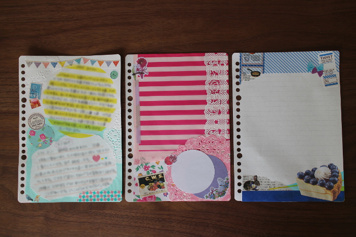 JUGEMテーマ:コラージュ ルーズリーフにコラージュする手紙に挑戦。というかコラージュに初挑戦。 難しそうだから今までスルーだったけど、やりだしたらおもしろくて気付けば外は朝。 とりあえず初めてだから、100均でつかえそうな素材を買い漁る。 最初に作った一枚。 イメージも湧かずとりあえず色味の可愛いものを集めてみた。 先に字を書いてしまうとあとで編集が面倒なことに気が付く。 2枚目。 おいおい、これじゃ全然文章が書けんぜよ! でも、可愛いから満足。紫のさし色...