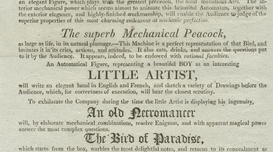 JUGEMテーマ:博物館 1800年代のロンドンで からくり人形館についてのすばらしさが新聞記事になっています 当時、王様も見物に行くなど大人気でした〜 From a broadside for a Mechanical Theatre show in London, c. 1800. 同じ時期の18世紀にスイスで作られたからくり人形です すらすらと上手に字を書いています A Swiss writing automaton from the 18th century.