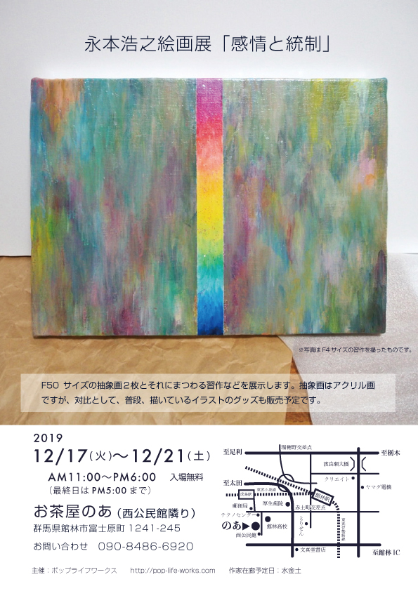 昨日、無事に搬入を終え、永本浩之絵画展「感情と統制」が遂にはじまりました! 会場はこんな感じです。 ほとんど、このメイン作品2点のための展示ですが、他に小品2点と6月のポップワークス太田で飾った大判とイラストグッズも取り揃えておりますので、良かったら、是非、会場にお越しください。実物は写真の感じと結構違うと思いますので! 会場のお茶屋のあさんの情報は下記リンク先まで お茶屋のあ ...