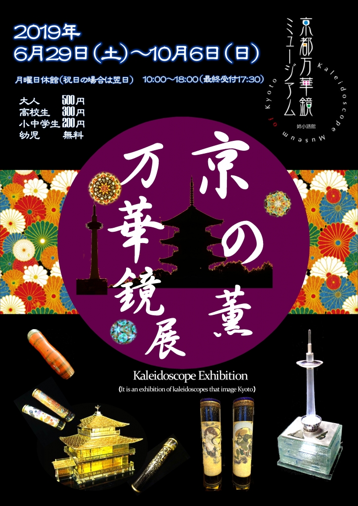 JUGEMテーマ:展覧会 京都万華鏡ミュージアムでは以下のように 『京の薫万華鏡展』を開催いたします。 期間:2019年6月29日(土)〜2019年10月6日(日)月曜休館(祝日の場合は開館し翌日休館) 時間:10時00分〜18時00分(入館は17:30時まで) 場所:京都万華鏡ミュージアム 展示室 京都をテーマにした作品を展示致しております。 ぜひこの機会にお越しください。 大人500円 高校生300円 小中学生200円 幼児無料