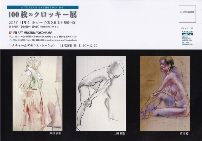 JUGEMテーマ:展覧会 100枚のクロッキー展 2017年11月21日(火)〜12月3日(日)(月曜休廊) 10:00〜19:00(最終日は17:00まで) FEI ART MUSEUM YOOHAMA レクチャー&デモンストレーション見てきました。 大勢の人でにぎわっていました。 後日YouTubeにも様子がUPされるようです。 「人物クロッキーの基本的な観方、捉え方の解説」 ?人体のフォルムをキューブ(立方体)で捉える。広田 ?人体の構造を骨格、筋肉で捉える。上田 ?人体を...