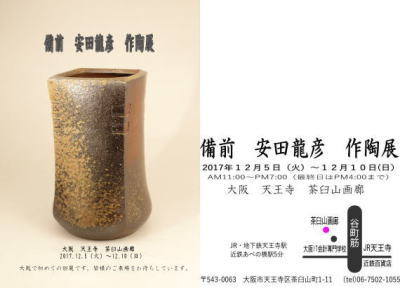 JUGEMテーマ:展覧会 ■個展のお知らせ■ 備前 安田龍彦 作陶展 2017年 12月5日(火)〜12月10日(日) AM11:00〜PM7:00(最終日はPM4:00まで) 大阪 天王寺 茶臼山画廊 〒543-0063大阪市天王寺区茶臼山町1-11 tel 06-7502-1055 http://www.eonet.ne.jp/~chausuyamagarou/ 今年は、築窯から20回目の窯焚き。 大阪で初めての個展となります。 皆様のご来場を心よりお待ちしています。 -yasuda-