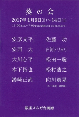 JUGEMテーマ:展覧会 武蔵野美術学園 オープンセミナー講師の佐藤功先生が参加されるグループ展が開催されます。 是非、ご高覧下さい。ここに本文を記入してください。 葵の会 2017年1月9日(日)〜14日(土) 11:00a.m.〜7:00p.m.(最終日は5:30p.m.まで) 銀座 スルガ画廊 〒104-0061 東京都中央区銀座6-5-8 トップビル2F TEL 03-3574-8691