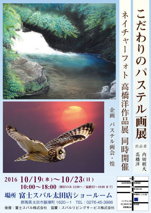 1日遅れてしまいましたが、昨日から内田剛大さんによる「こだわりのパステル画展」が開催中です。今回もチラシ、ポスター作らせて頂きました。 今回は、高橋洋さんのネイチャーフォトも同時に展示されます。 ご興味のある方は是非。 JUGEMテーマ:展覧会