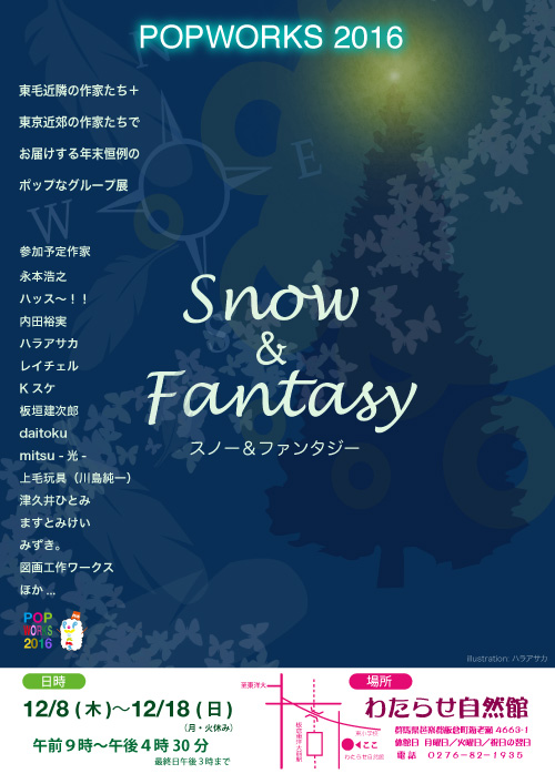 今年もPOPWORKS2016の開催が決定しました!! 参加作家紹介は、こちらのブログで随時行っていきます!! 東毛中心の作家たちが作る雪と幻想の世界!! 是非お楽しみに!! JUGEMテーマ:展覧会