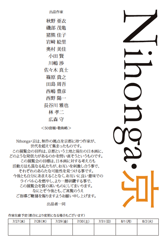 JUGEMテーマ:展覧会 毎年恒例の夏の2つの展覧会に、今年も出品致しましたので、ご案内させていただきます。 暑いさなかで恐縮ですが、ご高覧頂けましたら幸いです。 第8回 Nihonga・京展 (制作の拠点を京都に持つ日本画家16名の日本橋三越企画展覧会) 2016年7月27日(水)〜8月2日(火)日本橋三越特選画廊 10:30〜19:30(最終日は17:00閉場)7月30日(土)14:00〜 ギャラリートーク 50号1点、10号1点 団扇絵 1点 の新作を出品しています。 7...