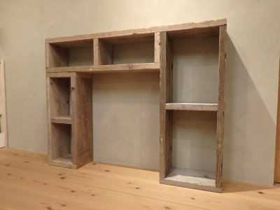 足場板(古材)で収納棚をつくりました。 対面キッチンのダイニング側にカウンターのように設置します。 ダイニングテーブルで事務作業などをおこなうため、A4ファイルの入るサイズでのオーダー。 キッチン笠木に置いていた雑貨も、こちらの棚へ仕舞うことでスッキリしそうです。 何気なく。。。真ん中の空間にテーブルが入る設計にもなっています^^ &rd...