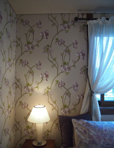 JUGEMテーマ:フランス直輸入家具・ブランディボワール・MIS EN DEMEURE 先日からのつづき→ ★ ★ 壁紙張替。 こちらは寝室をニナキャンベルの壁紙に張り替えました。 この建具脇の柱まで、壁三面の張り替えです。 ニナキャンベルの『オーチャード・ブロッサム』 この壁紙を張ることで寝室に春が訪れたようで 居心地のいい寝室になりました。 このベットカバーにもぴったり! 大柄で大胆な構成のパターンではありますが 花や枝との余白が程良くあり、取り入れやすいデザイン...