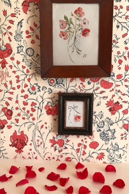 JUGEMテーマ:インテリアデザイン 昨日に続き、壁紙とアートの相性です〜 赤色のカーネーションが描かれている壁紙に真っ赤なポピーのボタニカルアートがかわいいですね〜