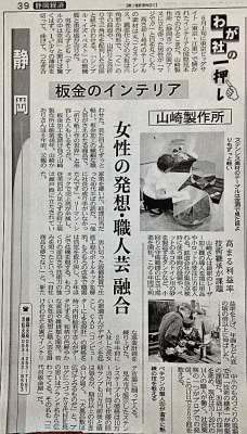 JUGEMテーマ:インテリアデザイン 2015年6月19日の日本経済新聞に掲載していただきました。 先日東京ビックサイトでの展示会を取材していただき、記事にしていただきました。 日本経済新聞 山本様、ありがとうございました。 三代目板金屋 http://www.bankin-ya.jp/