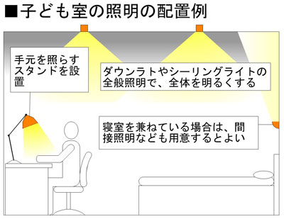 JUGEMテーマ:インテリアデザイン 今回は、子供室の照明計画を紹介します。 「子供室」の照明は、年齢に応じて器具やライティングを変えられる照明計画が必要です。 子どもは、部屋のあっちこっちでさまざまな行動をとり、大人と違って予測がつかないために、「子ども室」の主照明はダウンライトやシーリングライトを使用し、部屋全体をくまなく明るくできるようにする必要がある。特に、10歳くらいまでは、視力がまだ定まっていない段階なので、明るく影のできない照明を選ぶことが大切である。(下の図) ...
