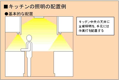 JUGEMテーマ:インテリアデザイン 今回は、「キッチン」の照明計画について紹介します。 「キッチン」は、住宅の中でも最も作業の多い空間であり、充分な明るさと食材や食器の色の見え方の良さ(演色性)を求められるところでもあります。「キッチン」の照明計画の基本的な方法は、キッチンの部屋全体と棚の中の物を確認しやすいように天井やその付近に「全般照明」を設けることと、作業行うシンクやコンロ、作業台の上部に作業灯を設けることです。(下の図) それでは、「全般照明」の器具としては、何を使うかと言い...