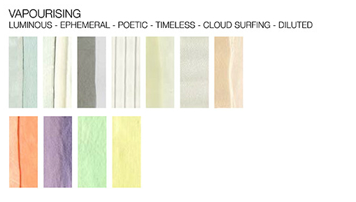 JUGEMテーマ:プロダクトデザイン 前回のテーマのつづき。 制作前にインターカラーをチェックしちゃおう、というお話。 前回は2014-2015AWでしたが、 今回は2015SSと2015AWをチェック。 2015年 spring-summer 今季のテーマは DIALOGUES Continuum Synaesthesia Fun-tastic 対話 連続 共感覚 素晴らしい+楽しい 気化する・蒸発する、というような意味の VAPOURISINGがテーマ。 発光 - 儚い・短命 - 詩的な - 永遠の - 雲のサーフィン - 濃度の薄い 湯気のように立ち上って すぐ消え...