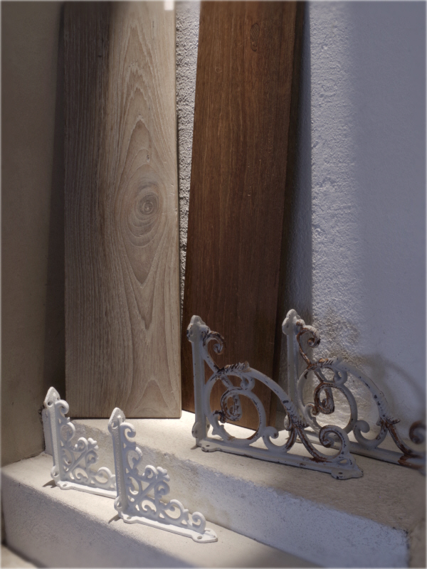 今日は DIY アイテムに 棚板・棚受け金具・ウォールパネルが入っていますので そちらをご紹介いたしますね 最初に棚板から 天然のチーク材を ホワイトとブラウンの2種類に仕上げたモノです 内装のイメージに合わせて 選択できますね 棚受けのブラケットも 再入荷しています コチラは 奥行き20センチ以下の棚に ご利用ください もう少し奥行きのある棚には こんなのもあります 棚に取り付けたのを ウラから見たところですが このままの感じで 吊...
