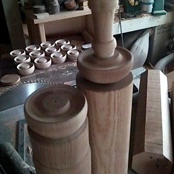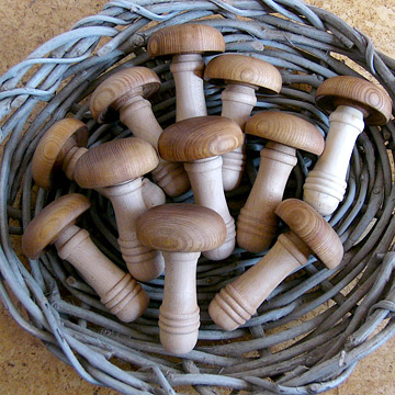 ダーニングマッシュルーム製作途中の画像を少々。 →ダーニングマッシュルーム販売ページ ウチは傘の部分と柄の部分を分けて削り出しています。 ↑右から、エンジュの材を大まかに荒削り→木工旋盤にセットする為に丸棒に加工→傘が1個削れた所。 ↓1個ずつ切り離しながら作業を進めます。 ↑柄になるモミジ枝が待機してます。これも大まかに丸棒にして木工旋盤で削ります。 ↓画像はリンゴ材のを削ってる所ですが、モミジ材も同じ作業です。 削ってる動画はFBページにあ...