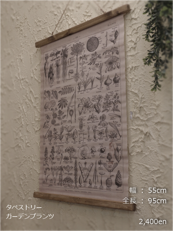 お家やお店のなかに 壁に掛けるスペースは 残っていますか なにも掛けない方がいい壁もあれば なにかしないと寂しい壁もありますね そこで今日は 壁に掛けて空間を演出する雑貨をご紹介 最初は タペストリーから 様々な植物がならぶ フレンチタペストリー アンティークなモミの木で挟まれた 麻の生地に モノクロームで描かれてます キッチン&ダイニングシーンに似合いそうです コチラはスチームシップと書いてあります アメリカの古い蒸気客船がモチーフのようです ...