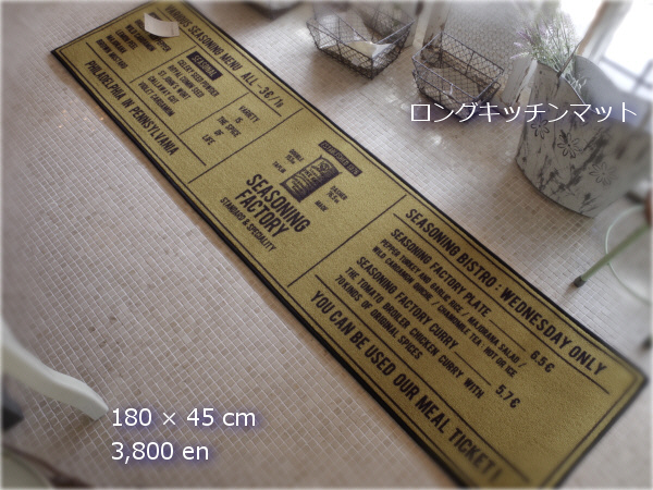 巷で人気のバル その陽気でおしゃれなスタイルを おうちにも取り入れちゃうようなマット オリーブカラーのキッチンマットは 1m80cmと長めなサイズ 料理がんばるぞ ! って気になるデザインでしょ トイレもこんなマットがあると 楽しいですよね ♪ どちらのマットも滑り止め加工 お洗濯はネット洗いの弱でお願いいたします 新商品からバルスタイルマットの ご紹介でした JUGEMテーマ:インテリア雑貨
