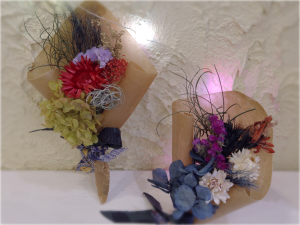 さて この週末あたりを皮切りに クリスマスムードも最高潮といったところでしょうか 本当は100本のバラの花束を贈りたいけれど お金がチョイ足りない ・ とか なにより100本抱えて歩くのが恥ずかしい貴方に 朗報があります ミニブーケです 手のひらサイズで スッと差しだせます それさえも 恥ずかしい貴方に 朗報があります プチブーケです 手の指サイズで ちょこんと差しだせます このふたつのブーケは 作家さんによる ドライ&ブリザード...