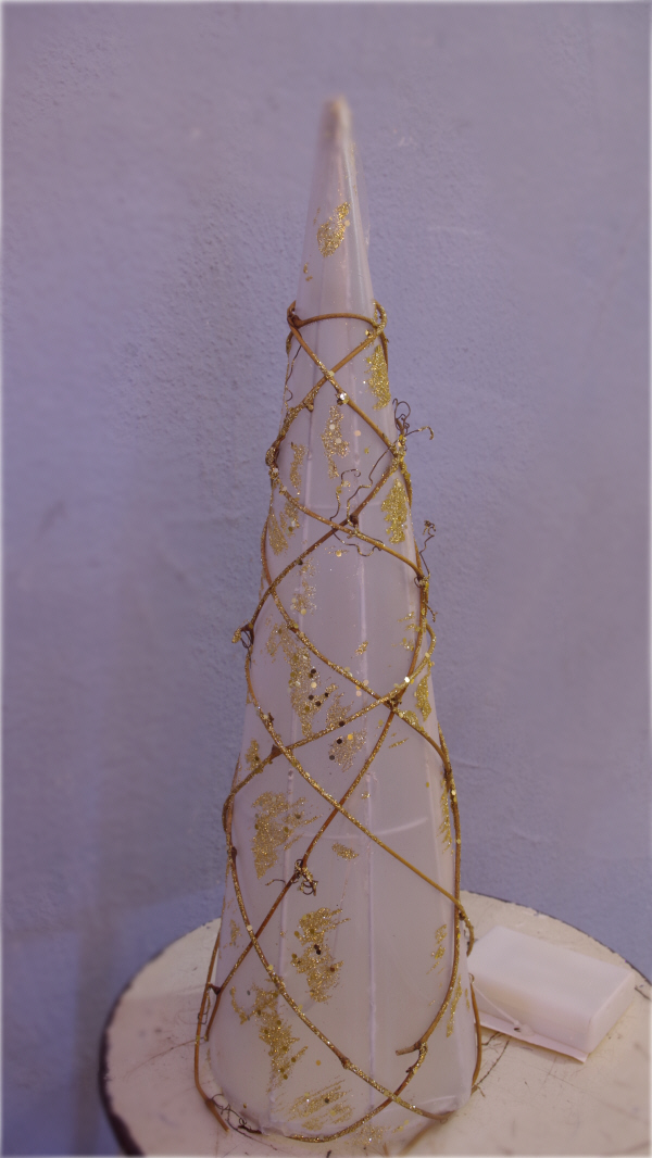 今日はふたつのクリスマスイルミネーションを ご紹介いたします まずは コーン型のコチラから オーガンジーのベースに ゴールドの装飾が控えめ コードの先には単三電池 × 3本のボックス その スイッチを入れると オーガンジーの布越しに LED球がキラメキます 乱反射するクロスフェードが幻想的でウットリします 直径 12cm × 高さ 40cm *クリスマスイルミネーションコーン ¥ 2,100 続いては この 裸電球を並べただけのようなモノ...