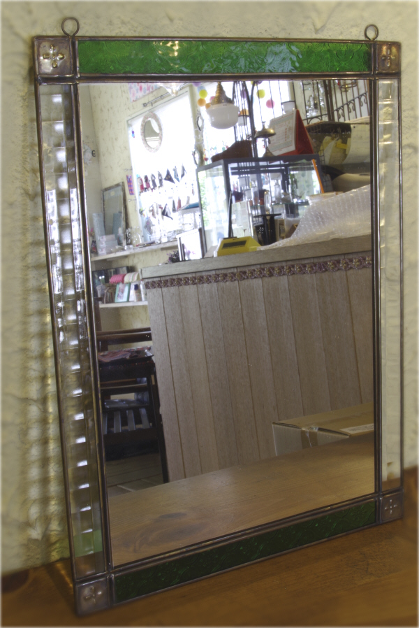 まずは インテリアミラーからご紹介いたしましょう サイズは 幅30? × 高さ40? ( ミラー面は 25? × 35? ) カラーは全部で4色 左右の枠はチェッカーガラスで 上下がグリーンのステンドグラスのタイプ ブルーのタイプ アンバーのタイプ そして クリアーのタイプ このクリアータイプだけは 上下枠もチェッカーガラスなので 4方すべてチェッカー柄になります チェッカーガラス部分のアップ 続いて ステンドグラス...