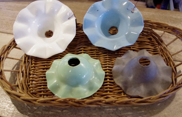 古いミルクガラスシェードが すこしですが 入荷しましたので ご紹介しましょう すべて一点モノで シェードのかたちはフリルタイプ 直径が20cm は ホワイトと水色 16cm は ミントとアンティークガラス色で 全部で4点あります ミントカラーのアップ画像です ミルクガラスならではの スジと凸凹感 点灯してみましょう この 優しい透け具合が ミルクガラスの特徴です 水色のほうも みてみましょうか むむっ ‥ ちょっと予想外 ...