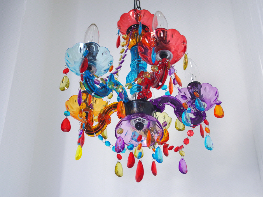 やっとお天気になりましたね ♪ 雨で滞ってた入荷商品の撮影 (汗 晴れてるうちにドンドン進める予定です 今日から数回は照明器具をアップいたしますので おたのしみに さて 今日はこのシャンデリアのご紹介です 派手でしょ (笑 今までもあった マルチカラーのカラフルシャンデリアですが 従来品との違いは そのサイズ ご覧のように直径は約35cmとコンパクト 今時期でいうと西瓜くらいでしょうか シャンデリア球のソケットは5つあります おすすめは25w以下の電...
