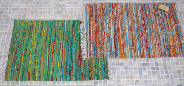 インド製のラグ&マット サリ のご紹介です まずは玄関マットサイズのコチラ ホワイトベースとグリーンベースの どちらもマルチカラー 1枚のマットのなかにたくさんの色が混じります アップでみてみましょう ホワイトのアップです インドマット言えば コットン素材が定番ですが レーヨンやナイロンなどの化繊を使っています サラッとした質感を出すためでしょうか グリーンのアップ ハンドメイドならではの仕事 細かく編まれた素材を 不均一に紡ぐように並べ ライン状に織られてい...